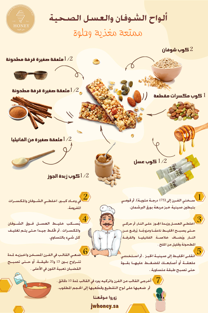 مع حلاوة العسل الطبيعية والملمس المرضي للشوفان والمكسرات، تقدم ألواح الشوفان بالعسل مزيجًا رائعًا من النكهات والعناصر الغذائية ، سواء كنت تستعد ليومك أو تدلل نفسك بحلوى خالية من الجلكوز ، فإن هذه الألواح هي شهادة على تنوع العسل وحلاوته في عالم الطهي.